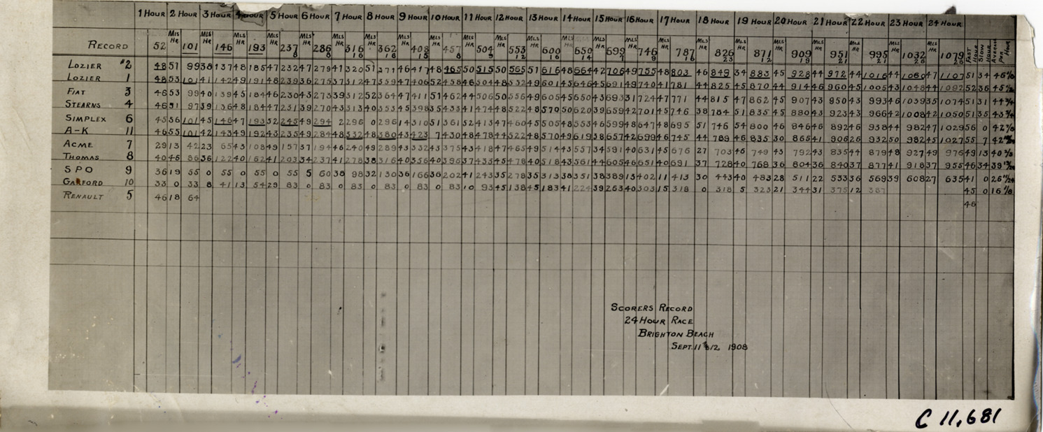 Favorite this☆ Scorer's record, 1908 Brighton Beach 24-hour race Description: View of scorer's record for 1908 Brighton Beach 24-hour race. Printed on front: "Scorers record, 24 hour race, Brighton Beach, Sept. 11 and 12, 1908." Handwritten on back: "Races and racing--Brighton Beach, 1908." Details Resource ID: na011098 Subject: Automobile racing--Records--New York (State)--New York Automobile racing--New York (State)--New York Photographic prints Date Issued: 1908-09 Format: 1 photographic print ; 4 x 10 in. Member of: National Automotive History Collection Lazarnick Collection Filing Location: Races and racing--Brighton Beach, 1908 #1 Negative Number: Negative #C11,681 Rights: Physical rights are retained by DPL. Copyright is retained in accordance with U.S. copyright laws.