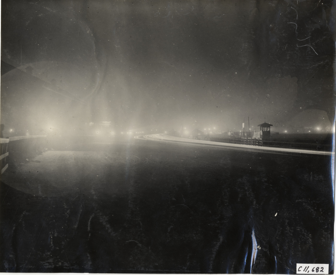 Nighttime view of racetrack during 1908 Brighton Beach races in New York. Stamped on back: "Spooner & Wells, Inc., photographers, telephones 3472-3473 Columbus, 1931 Broadway, New York." Handwritten on back: "Races and racing--Brighton Beach, 1908."