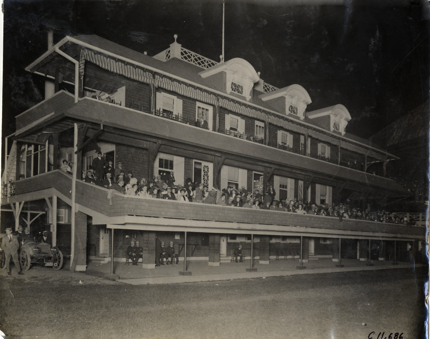 Nighttime view of spectators watching race from balconies of clubhouse during 1908 Brighton Beach races in New York. Stamped on back: "Spooner & Wells, Inc., photographers, telephones 3472-3473 Columbus, 1931 Broadway, New York." Handwritten on back: "Races and racing--Brighton Beach, 1908."