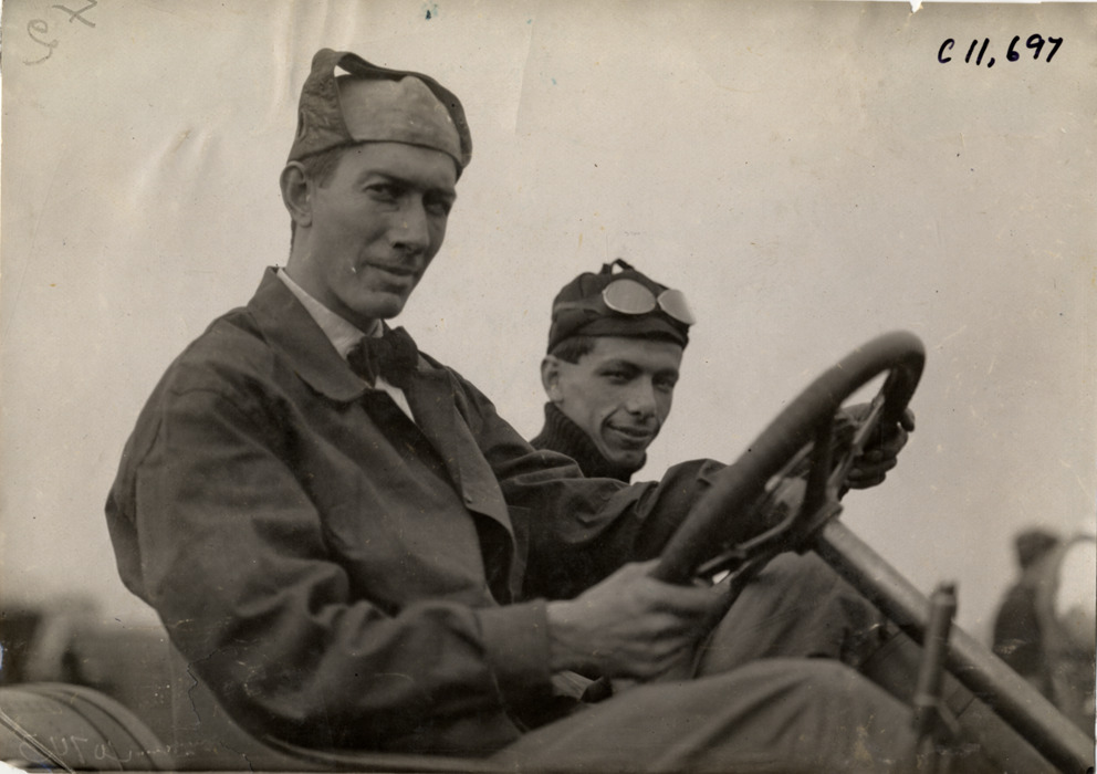 Driver and passenger in racecar, 1908 Brighton Beach races