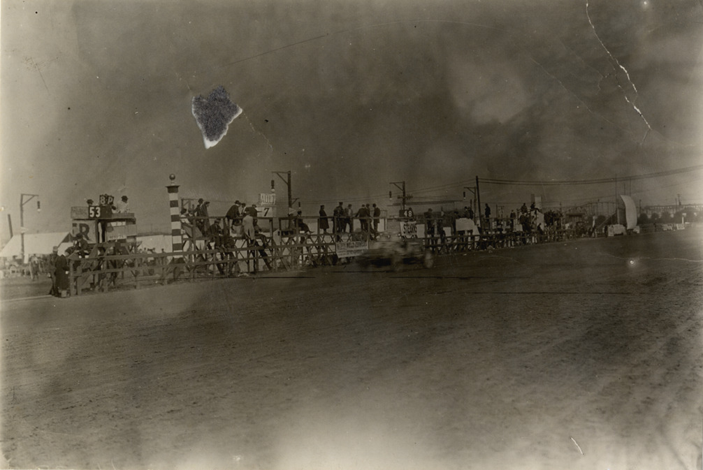 Racecar passing in front of bleachers, 1908 Brighton Beach races