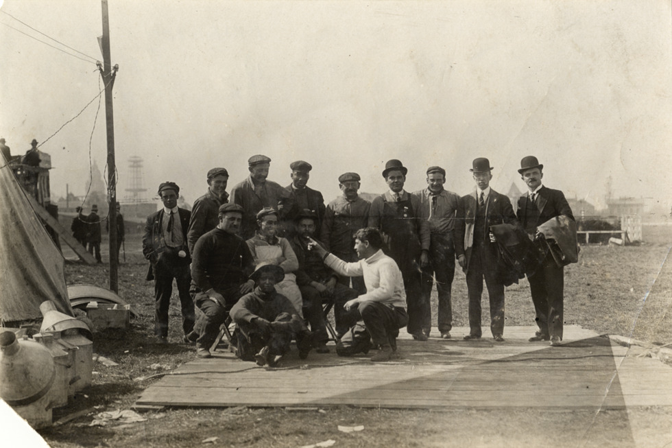 Group portrait of men at racetrack, 1908 Brighton Beach races