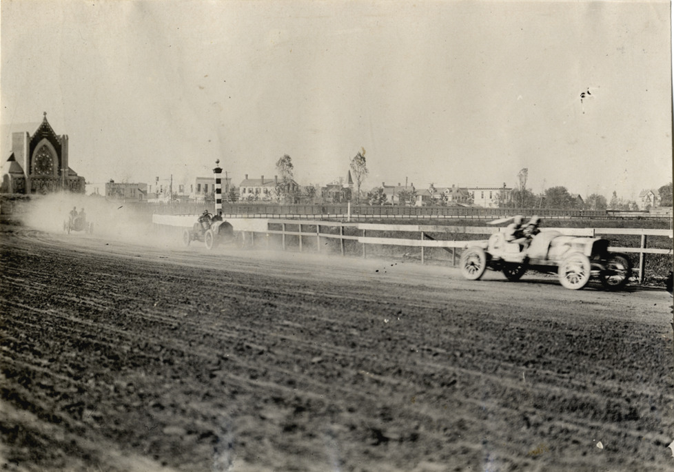 View of three cars racing on track at 1908 Brighton Beach races in New York. Stamped on back: "Spooner & Wells, Inc., photographers, telephones 3472-3473 Columbus, 1931 Broadway, New York." Handwritten on back: "Races and racing--Brighton Beach, 1908."