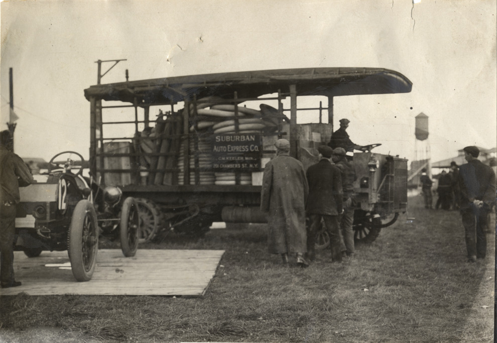 View of driver in Hewitt truck owned by the Suburban Auto Express Co. during 1908 Brighton Beach races in New York. Truck carries a load of tires; racecar no. 12 in foreground. Handwritten on back: "Moore & Munger, body builders. Races and racing--Brighton Beach, 1908."