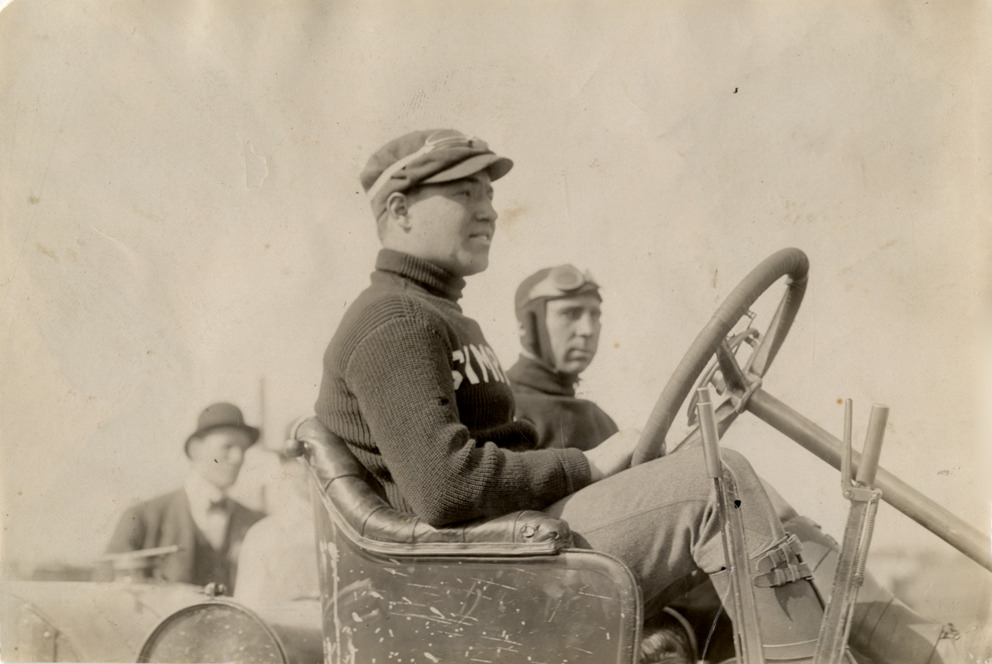 Driver and passenger in racecar, 1908 Brighton Beach races