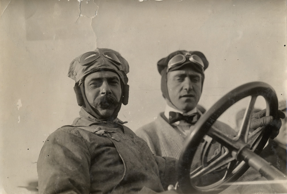 H.J. Kilpatrick and passenger in Hotchkiss racecar, 1908 Brighton Beach races