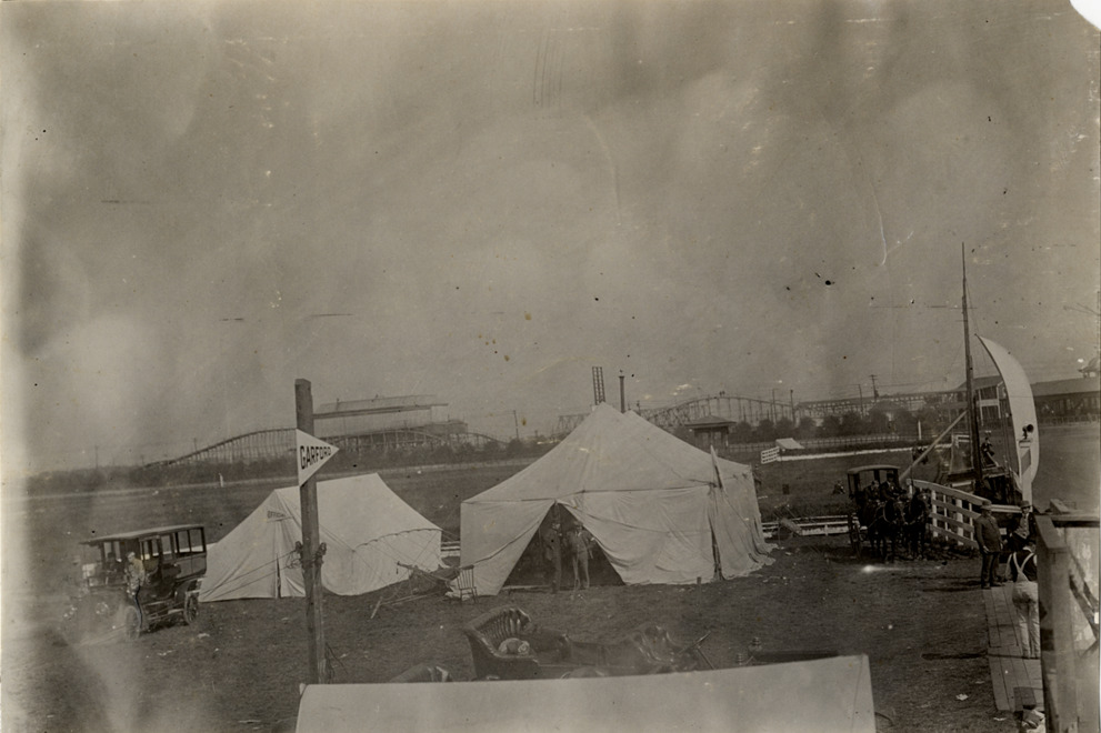 View of tents, car and horse-drawn wagon during 1908 Brighton Beach races in New York. "Garford" pennant on pole in foreground. Stamped on back: "Spooner & Wells, Inc., photographers, telephones 3472-3473 Columbus, 1931 Broadway, New York." Handwritten on back: "Races and racing--Brighton Beach, 1908."