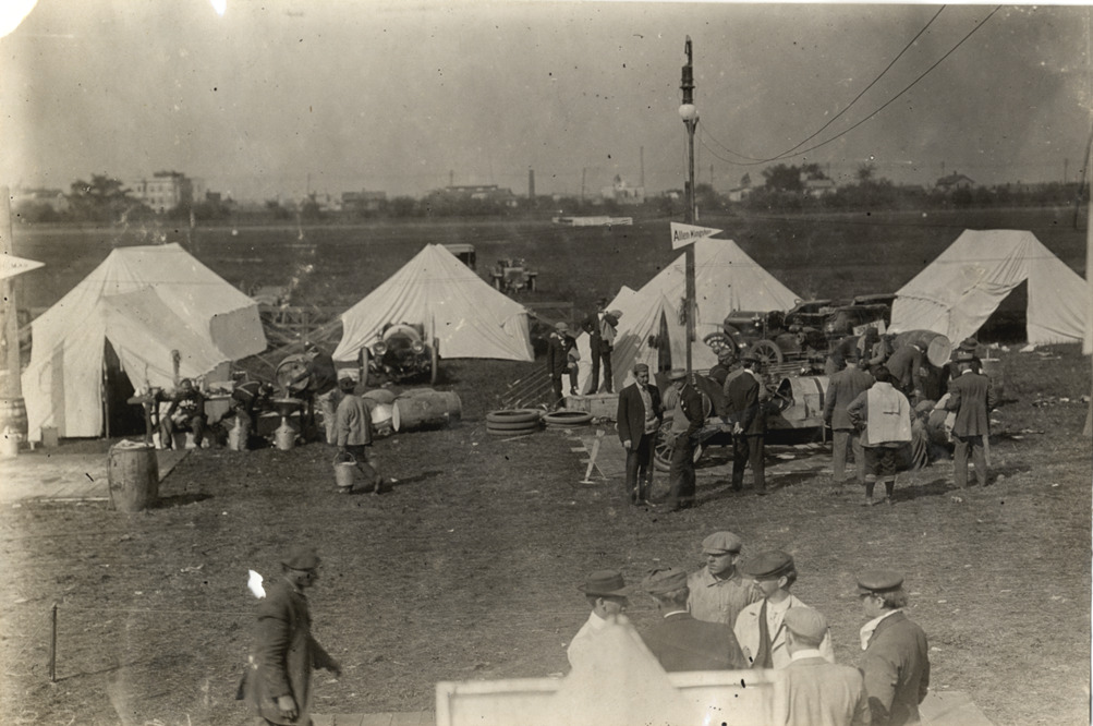 View of several men looking at Allen Kingston racecar no. 1 on platform in front of tents during 1908 Brighton Beach races in New York. "Allen Kingston" pennant displayed on utility pole. Group of men stand in foreground. Stamped on back: "Spooner & Wells, Inc., photographers, telephones 3472-3473 Columbus, 1931 Broadway, New York." Handwritten on back: "Races and racing--Brighton Beach, 1908."