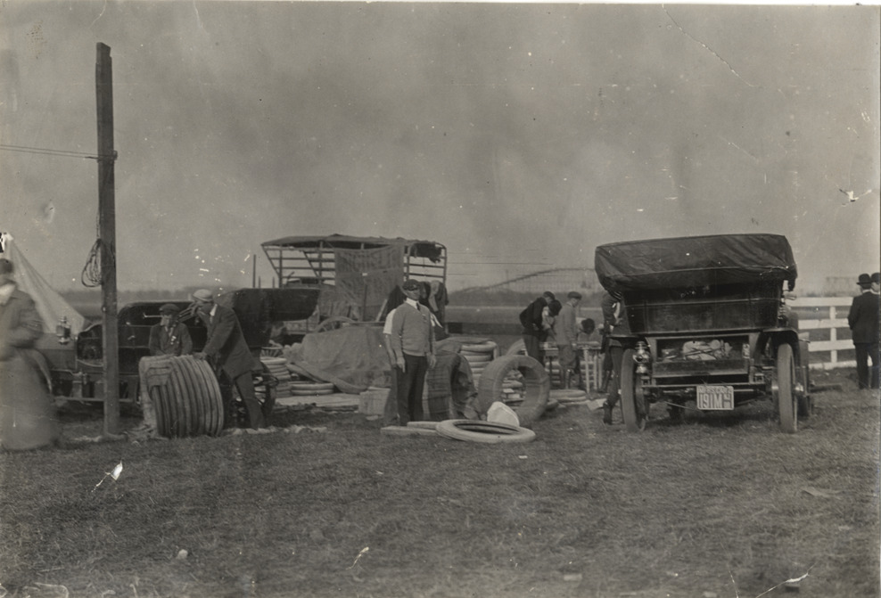 Men with stacks of Michelin tires, 1908 Brighton Beach races