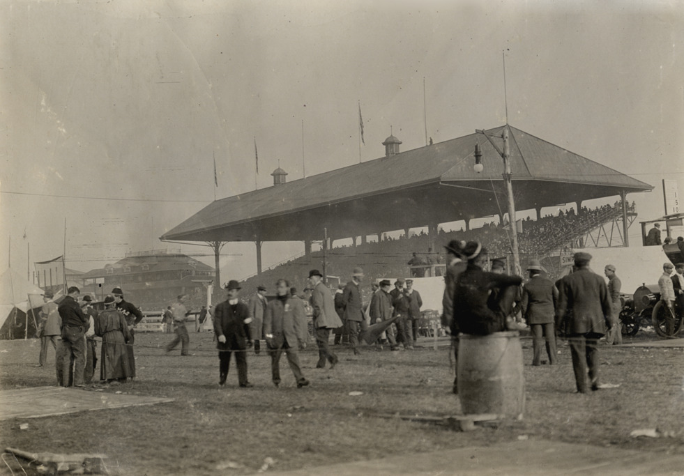 View of spectators walking on sidelines of racetrack during 1908 Brighton Beach races in New York. Grandstand in background. Stamped on back: "Spooner & Wells, Inc., photographers, telephones 3472-3473 Columbus, 1931 Broadway, New York." Handwritten on back: "Races and racing--Brighton Beach, 1908."