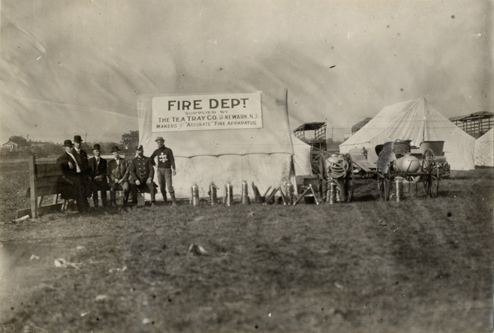 View of several men and police officer posing in front of Fire Dept. tent during 1908 Brighton Beach races in New York. Sign on tent reads: "Fire Dept. supplied by the Tea Tray Co. of Newark, N.J. Makers of accurate fire apparatus." Pumper and row of fire extinguishers displayed in front of tent. Stamped on back: "Spooner & Wells, Inc., photographers, telephones 3472-3473 Columbus, 1931 Broadway, New York." Handwritten on back: "Races and racing--Brighton Beach, 1908."