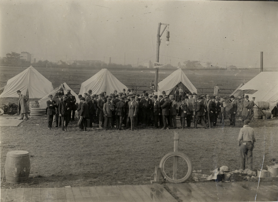 View of crowd of men standing in front of row of tents during 1908 Brighton Beach races in New York. "Renault" pennant displayed on utility pole. Stamped on back: "Spooner & Wells, Inc., photographers, telephones 3472-3473 Columbus, 1931 Broadway, New York." Handwritten on back: "Races and racing--Brighton Beach, 1908."