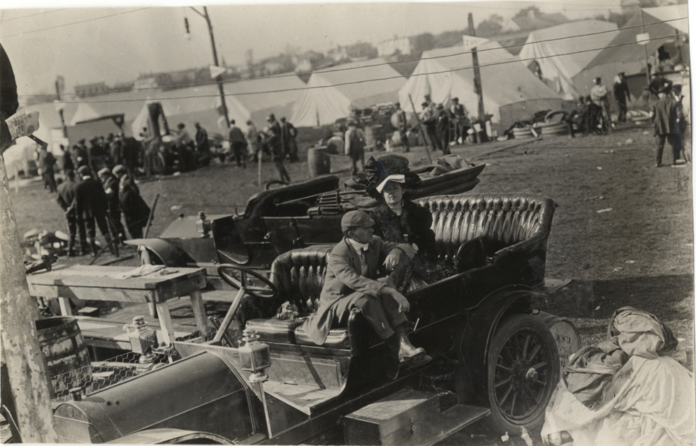 Couple resting in automobile, 1908 Brighton Beach races