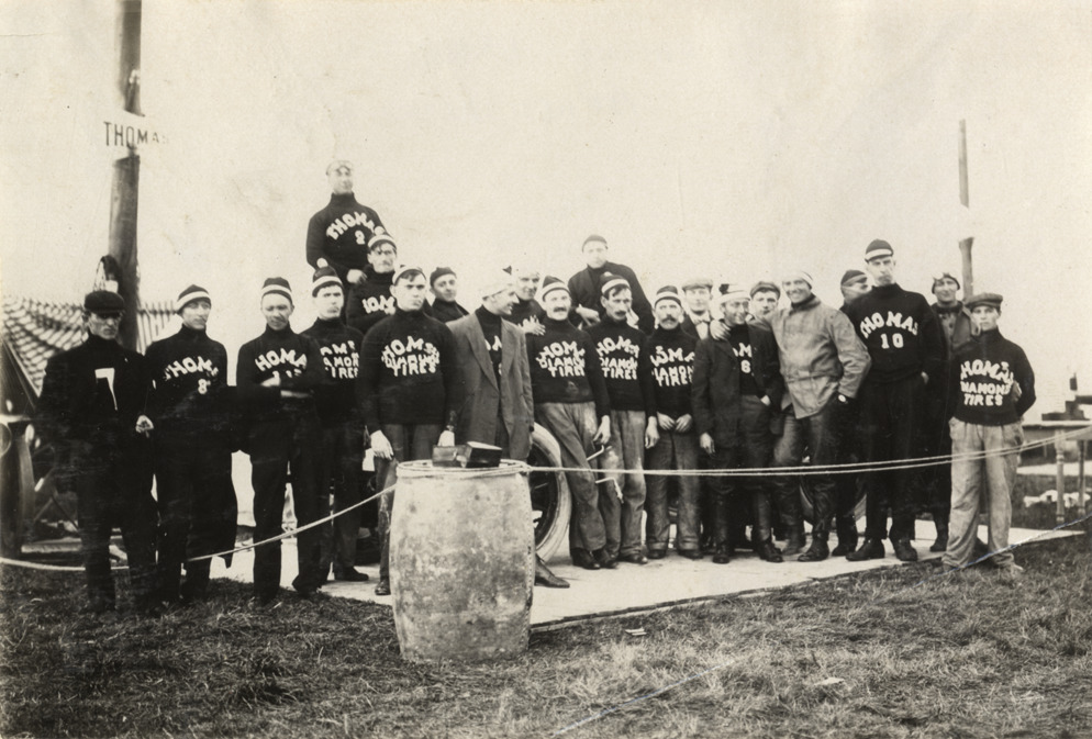 Group portrait of Thomas racing team or crew during 1908 Brighton Beach races in New York. Men wear jerseys with "Thomas, Diamond tires" printed on front. Stamped on back: "Spooner & Wells, Inc., photographers, telephones 3472-3473 Columbus, 1931 Broadway, New York." Handwritten on back: "Races and racing--Brighton Beach, 1908."