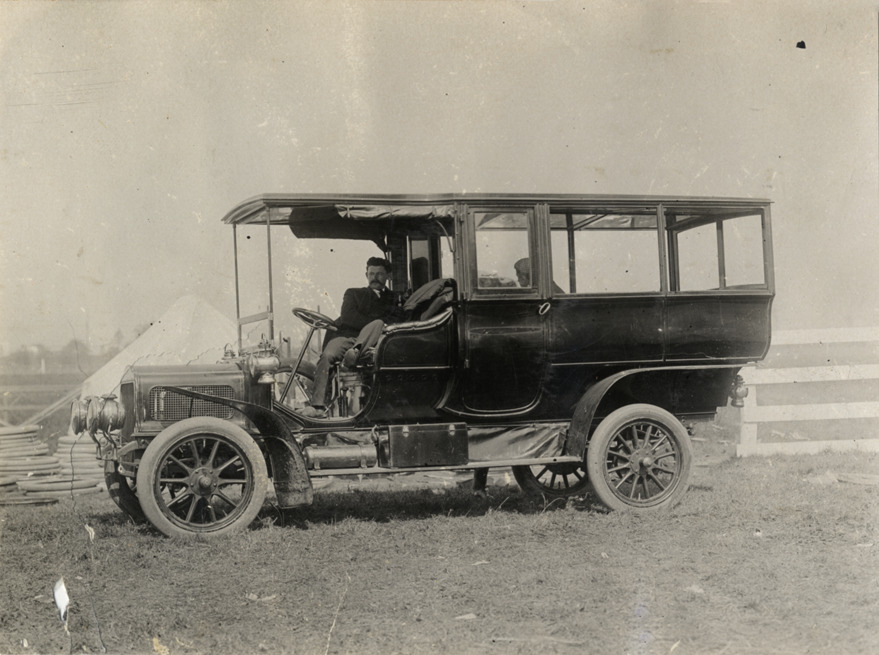 Driver resting in automobile, 1908 Brighton Beach races