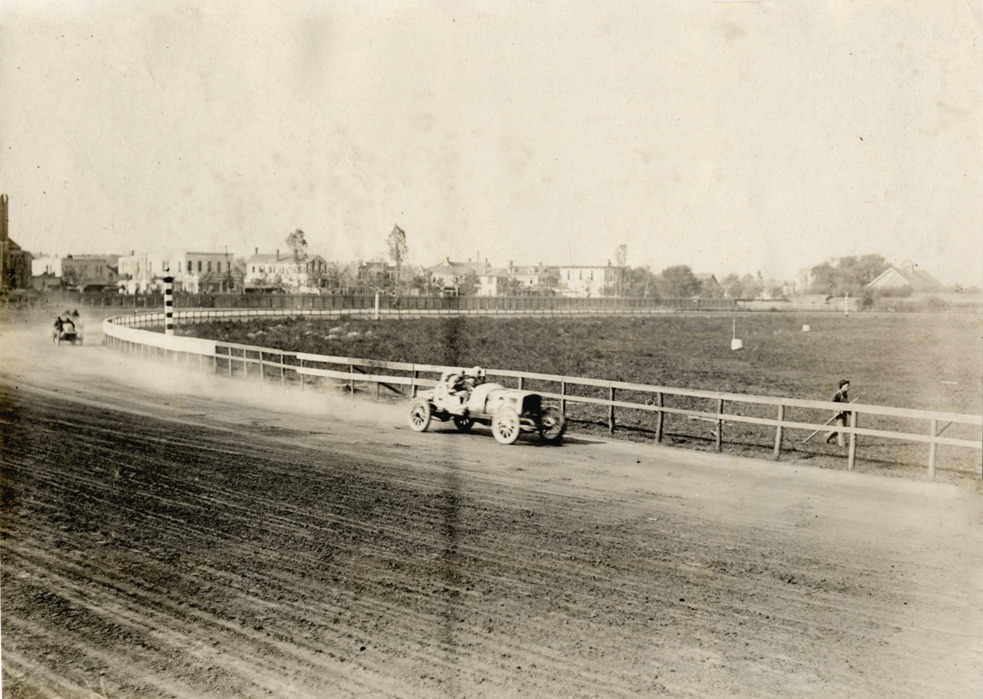 View of two cars racing on track during 1908 Brighton Beach races in New York. Racecar no. 2 in lead. Stamped on back: "Spooner & Wells, Inc., photographers, telephones 3472-3473 Columbus, 1931 Broadway, New York." Handwritten on back: "Races and racing--Brighton Beach, 1908."