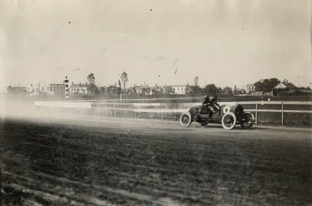 View of driver and passenger racing car no. 6 on track during 1908 Brighton Beach races in New York. Stamped on back: "Spooner & Wells, Inc., photographers, telephones 3472-3473 Columbus, 1931 Broadway, New York." Handwritten on back: "Races and racing--Brighton Beach, 1908."