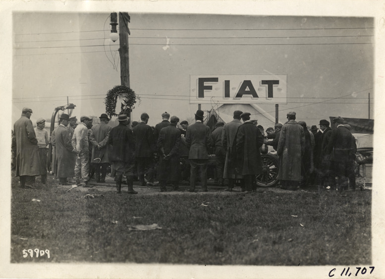 View of men surrounding Fiat car during 1909 Brighton Beach races in New York. "Fiat" sign displayed over tent in background; floral wreath displayed on utility pole. Stamped on back: "Spooner & Wells, Inc., photographers, telephones 3472-3473 Columbus, 1931 Broadway, New York." Handwritten on back: "Races and racing--Brighton Beach, 1909."