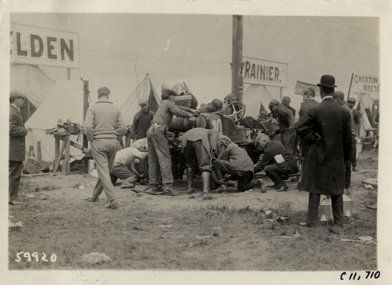 View of men working on Selden car no. 10 during 1909 Brighton Beach races in New York. "Selden" sign displayed over tent in background. Stamped on back: "Spooner & Wells, Inc., photographers, telephones 3472-3473 Columbus, 1931 Broadway, New York." Handwritten on back: "Races and racing--Brighton Beach, 1909."