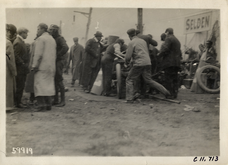 Men working on Selden racecar, 1909 Brighton Beach races