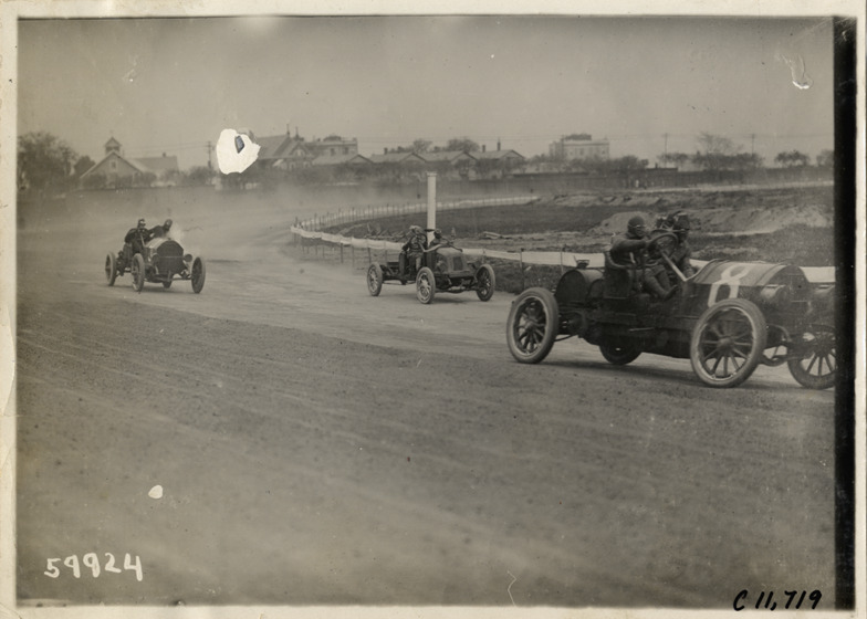 View of three racecars on track during 1909 Brighton Beach races in New York. Car no. 8 in lead. Stamped on back: "Spooner & Wells, Inc., photographers, telephones 3472-3473 Columbus, 1931 Broadway, New York." Handwritten on back: "Races and racing--Brighton Beach, 1909."