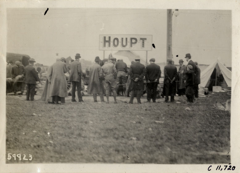View of men working on Houpt car during 1909 Brighton Beach races in New York. "Houpt" sign displayed over tent in background; onlookers stand nearby. Stamped on back: "Spooner & Wells, Inc., photographers, telephones 3472-3473 Columbus, 1931 Broadway, New York." Handwritten on back: "Races and racing--Brighton Beach, 1909."