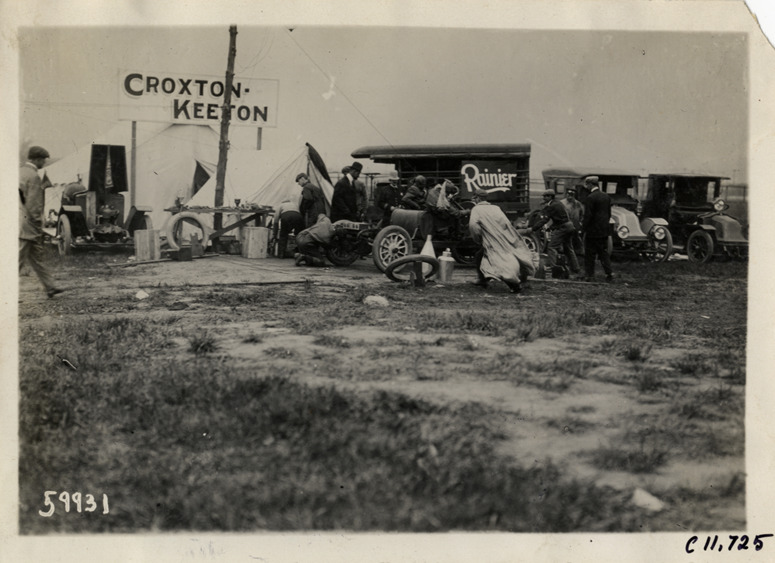View of men working on Croxton-Keeton car during 1909 Brighton Beach races in New York. "Croxton-Keeton" sign displayed over tent in background. Rainier truck parked on site. Stamped on back: "Spooner & Wells, Inc., photographers, telephones 3472-3473 Columbus, 1931 Broadway, New York." Handwritten on back: "Races and racing--Brighton Beach, 1909."