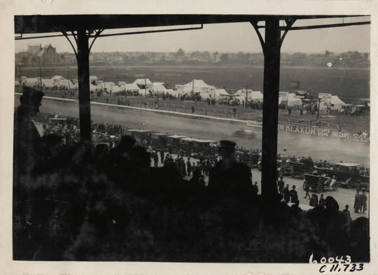 View from grandstand of racetrack during 1909 Brighton Beach races in New York. Tents and signs displaying names of automobile manufacturers in background. Stamped on back: "Spooner & Wells, Inc., photographers, telephones 3472-3473 Columbus, 1931 Broadway, New York." Handwritten on back: "Races and racing--Brighton Beach, 1909."