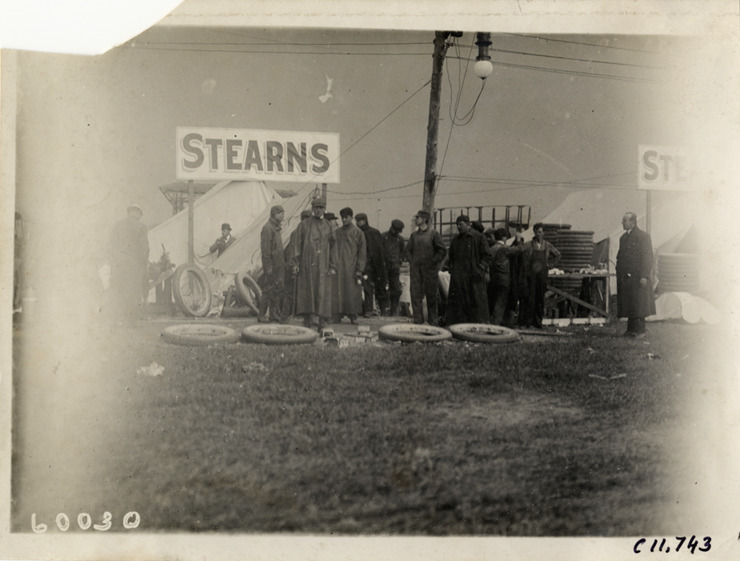 View of men standing in front of Stearns tent during 1909 Brighton Beach races in New York. Several tires in foreground. Stamped on back: "Spooner & Wells, Inc., photographers, telephones 3472-3473 Columbus, 1931 Broadway, New York." Handwritten on back: "Races and racing--Brighton Beach, 1909."
