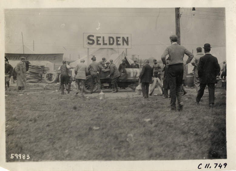 View of men working on Selden car no. 10 during 1909 Brighton Beach races in New York. "Selden" sign displayed over tent in background. Stamped on back: "Spooner & Wells, Inc., photographers, telephones 3472-3473 Columbus, 1931 Broadway, New York." Handwritten on back: "Races and racing--Brighton Beach, 1909."