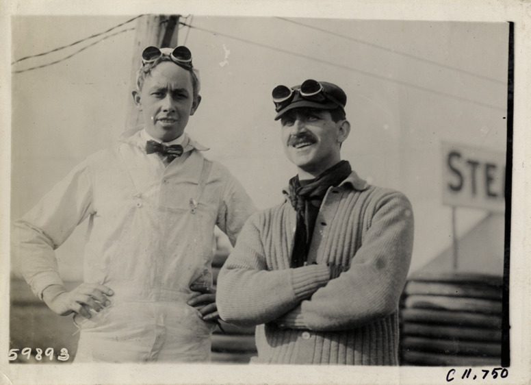 View of two racecar drivers wearing goggles during 1909 Brighton Beach races in New York. Stamped on back: "Spooner & Wells, Inc., photographers, telephones 3472-3473 Columbus, 1931 Broadway, New York." Handwritten on back: "Races and racing--Brighton Beach, 1909."
