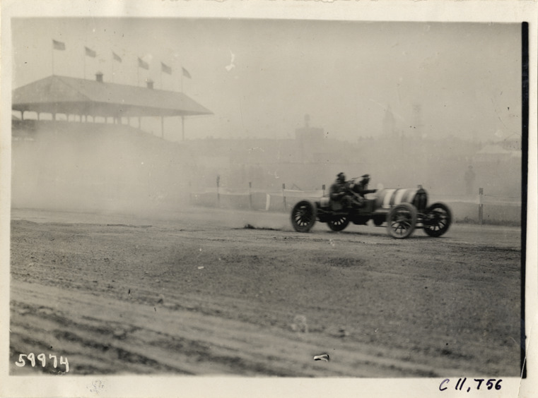 Driver and passenger in racecar, 1909 Brighton Beach races