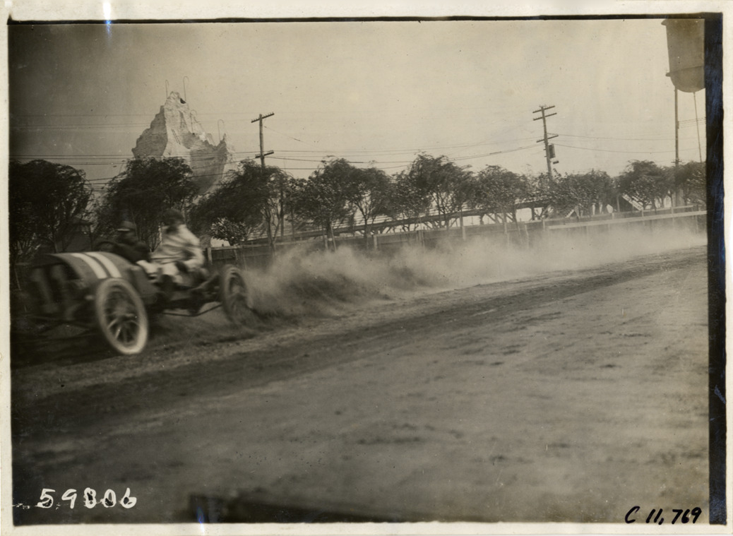 Driver and passenger in racecar, 1909 Brighton Beach races