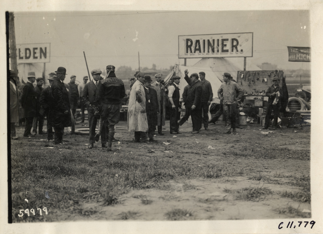 Men standing near Rainier tent, 1909 Brighton Beach races