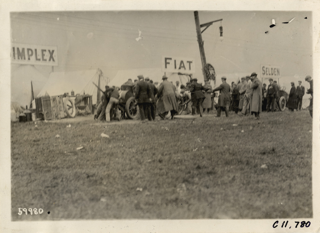 View of men working on Simplex car during 1909 Brighton Beach races in New York. "Simplex," "Fiat" and "Selden" signs displayed over tents in background. Stamped on back: "Spooner & Wells, Inc., photographers, telephones 3472-3473 Columbus, 1931 Broadway, New York." Handwritten on back: "Races and racing--Brighton Beach, 1909."