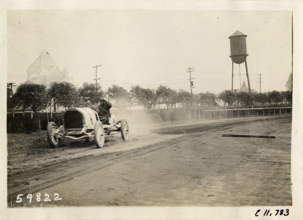 View of driver and passenger racing car on track during 1909 Brighton Beach races in New York. Water tower in background. Handwritten on back: "Races and racing--Brighton Beach, 1909."