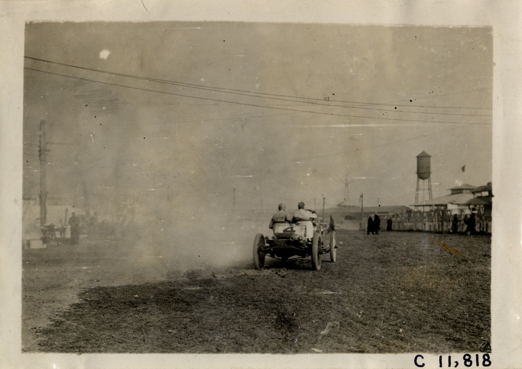 Rear view of driver and passenger in Lozier car no. 4 during 1909 Brighton Beach races in New York. Row of tents on left. Stamped on back: "Photo by Spooner & Wells, Inc. 1931 Broadway, N.Y." Handwritten on back: "Lozier. Races and racing--Brighton Beach, 1909."