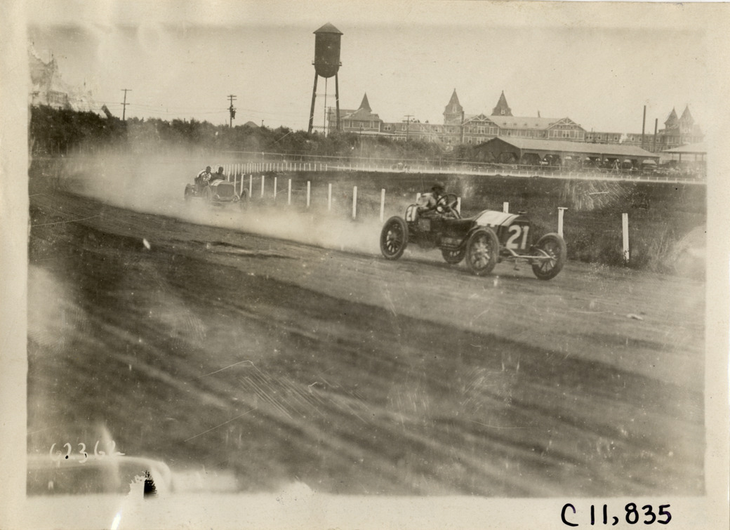 View of Louis Disbrow driving Marion car no. 21 during 1910 Brighton Beach races in New York, followed by Spencer Wishart driving an S.P.O. car. Stamped on back: "Spooner & Wells, Inc., photographers, telephones 3472-3473 Columbus, 1931 Broadway, New York." Handwritten on back: "Disbrow #21, Marion; Wishart, SPO. Races and racing--Brighton Beach, 1910."
