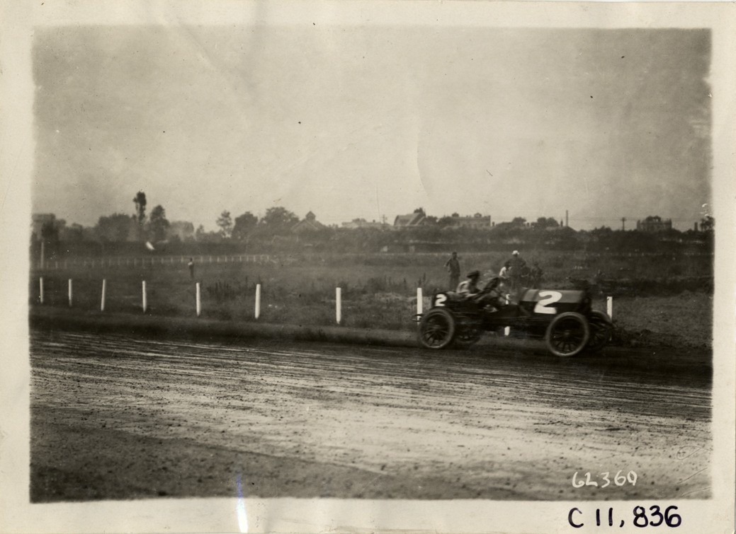 View of Louis Disbrow driving Knox car no. 2 during 1910 Brighton Beach races in New York. Stamped on back: "Spooner & Wells, Inc., photographers, telephones 3472-3473 Columbus, 1931 Broadway, New York." Handwritten on back: "Disbrow, #2 Knox. Races and racing--Brighton Beach, 1910."