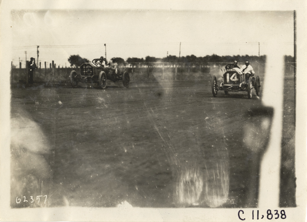 View of Ralph E. Beardsley driving Buick car no. 16 next to Lorimer driving Chalmers car no. 14 during 1910 Brighton Beach races in New York. Stamped on back: "Spooner & Wells, Inc., photographers, telephones 3472-3473 Columbus, 1931 Broadway, New York." Handwritten on back: "Beardsley, #16 Buick, Lorimer, #14 Chalmers. Neck and neck around first turn. Races and racing--Brighton Beach, 1910."