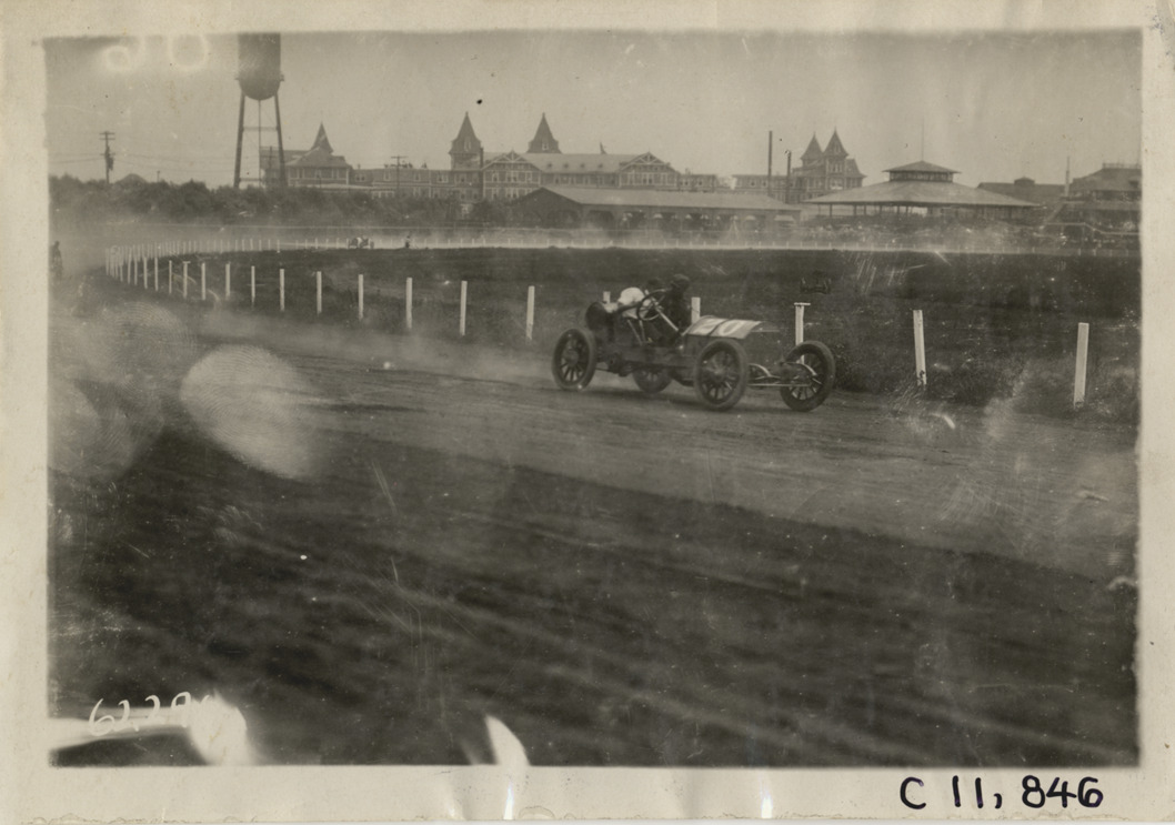 Jean Juhasz driving S.P.O. racecar, 1910 Brighton Beach races