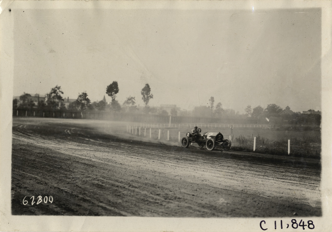 View of Louis Disbrow driving Knox car no. 2 during 1910 Brighton Beach races in New York. Stamped on back: "Spooner & Wells, Inc., photographers, telephones 3472-3473 Columbus, 1931 Broadway, New York." Handwritten on back: "Disbrow, #2 Knox. Races and racing--Brighton Beach, 1910."