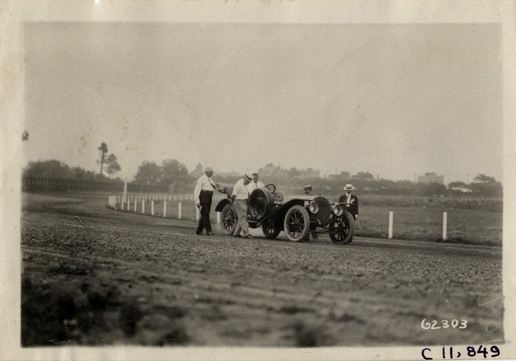 View of officials, standing alongside car, inspecting the racetrack during 1910 Brighton Beach races in New York. Stamped on back: "Spooner & Wells, Inc., photographers, telephones 3472-3473 Columbus, 1931 Broadway, New York." Handwritten on back: "Officials inspecting track. Races and racing--Brighton Beach, 1910."