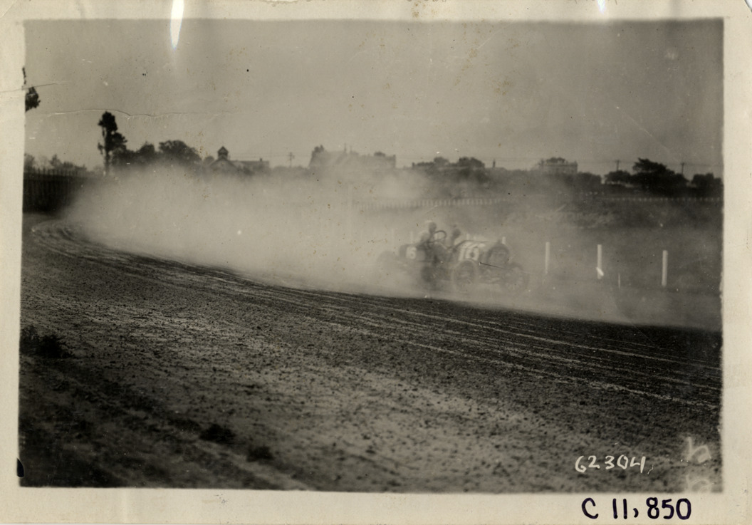 View of driver in Buick car no. 16 during 1910 Brighton Beach races in New York. Cloud of dust in background. Stamped on back: "Spooner & Wells, Inc., photographers, telephones 3472-3473 Columbus, 1931 Broadway, New York." Handwritten on back: "Buick 16 in the dust. Races and racing--Brighton Beach, 1910."
