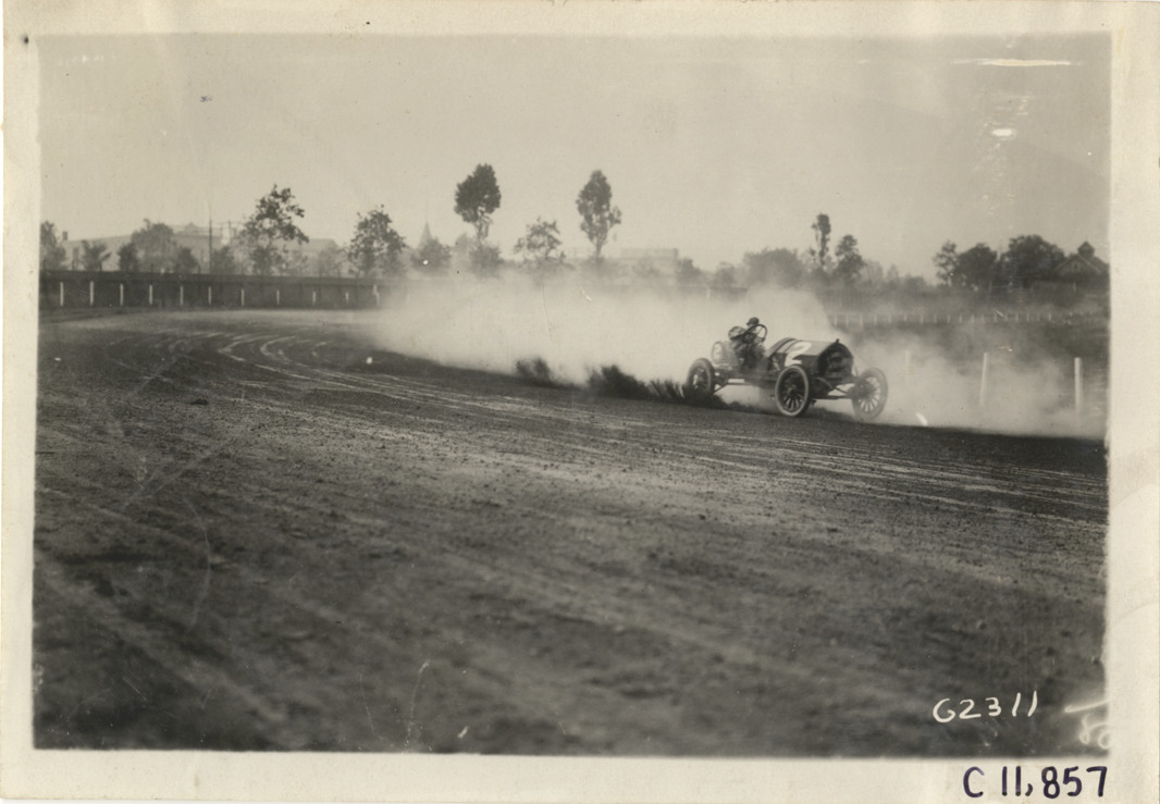 View of Louis Disbrow driving Knox car no. 2 during 1910 Brighton Beach races in New York. Stamped on back: "Spooner & Wells, Inc., photographers, telephones 3472-3473 Columbus, 1931 Broadway, New York." Handwritten on back: "Disbrow, #2 Knox. Races and racing--Brighton Beach, 1910."
