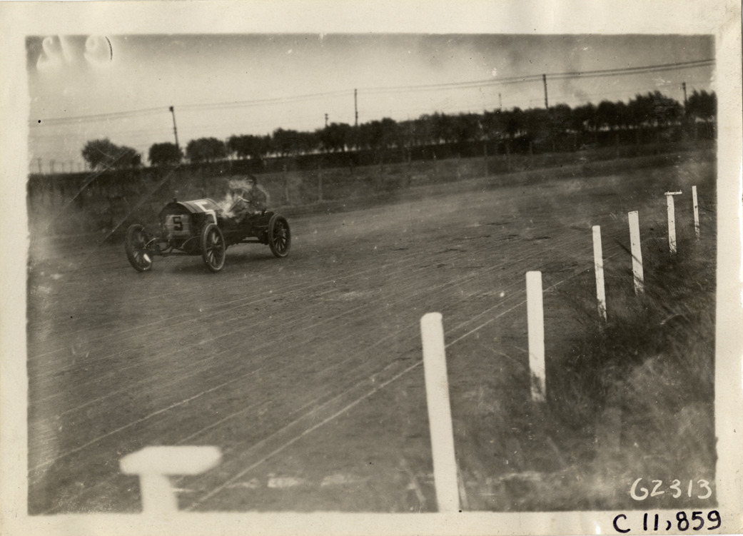 View of George Robertson driving Simplex car no. 5 in Five Mile race at 1910 Brighton Beach races in New York. Stamped on back: "Spooner & Wells, Inc., photographers, telephones 3472-3473 Columbus, 1931 Broadway, New York." Handwritten on back: "Robertson in #5 Simplex, winning 5 mi. heat against DePalma. Races and racing--Brighton Beach, 1910."