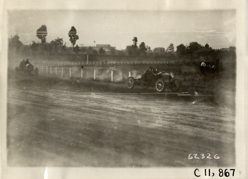 View of Croxton-Keeton car in Hour race during 1910 Brighton Beach races in New York. Stamped on back: "Spooner & Wells, Inc., photographers, telephones 3472-3473 Columbus, 1931 Broadway, New York." Handwritten on back: "Croxton-Keeton, 1 hr. race. Races and racing--Brighton Beach, 1910."