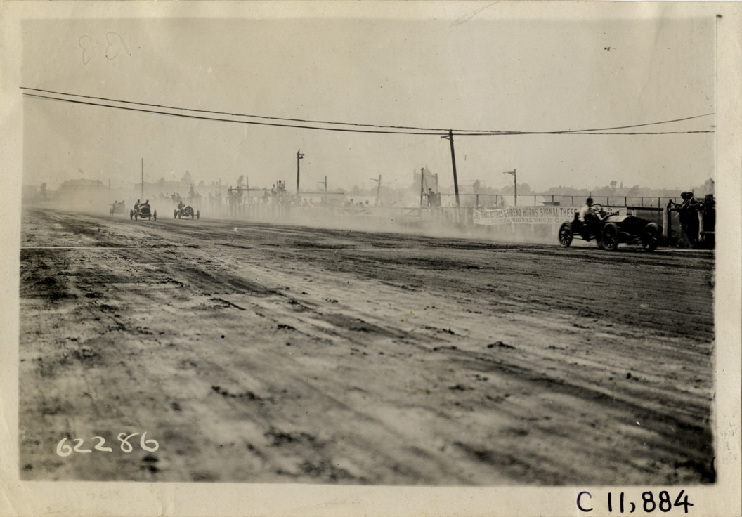 View of Louis Disbrow driving Marion car during 1910 Brighton Beach races in New York. Stamped on back: "Spooner & Wells, Inc., photographers, telephones 3472-3473 Columbus, 1931 Broadway, New York." Handwritten on back: "Disbrow, Marion leading event #4. Races and racing--Brighton Beach, 1910."