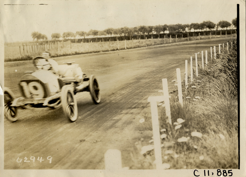 View of driver racing car no. 19 on track during 1910 Brighton Beach races in New York. Stamped on back: "Spooner & Wells, Inc., photographers, telephones 3472-3473 Columbus, 1931 Broadway, New York." Handwritten on back: "Races and racing--Brighton Beach, 1910."