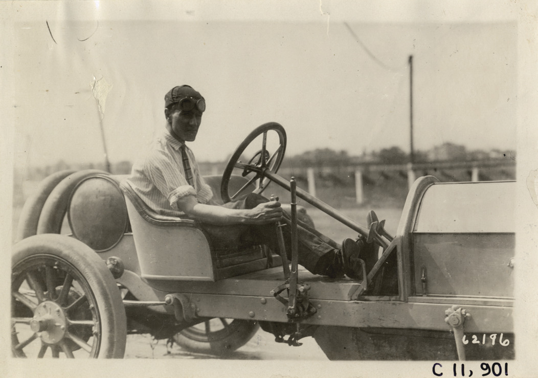 Close-up view of driver in car during 1910 Brighton Beach races in New York. Stamped on back: "Spooner & Wells, Inc., photographers, telephones 3472-3473 Columbus, 1931 Broadway, New York." Handwritten on back: "Races and racing--Brighton Beach, 1910."